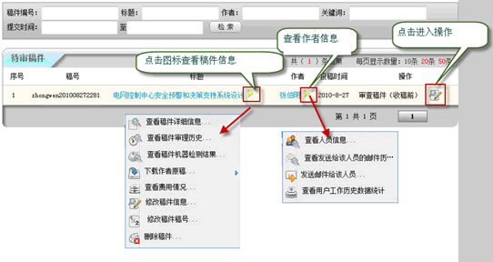 点击稿件标题,可以查看稿件的详细信息;点击作者姓名,可以查看作者的详细信息。 另外,为了便于对稿件和人员进行操作,系统把对稿件和人员的一些常用操作整合成菜单,点击稿件标题和人员姓名右侧的黄色箭头,可以看到菜单,如图示:
