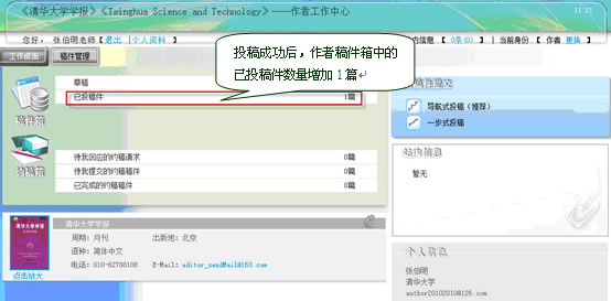 作者用户投稿成功后,可以在“稿件箱”中跟踪已投稿件的审理情况及稿件状态。