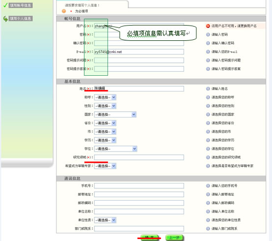 填写登录系统的账户名、密码,及个人邮箱、研究领域等相关信息,带*号为必填项。如下图示: